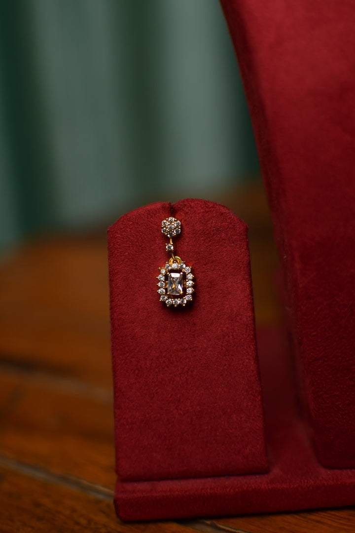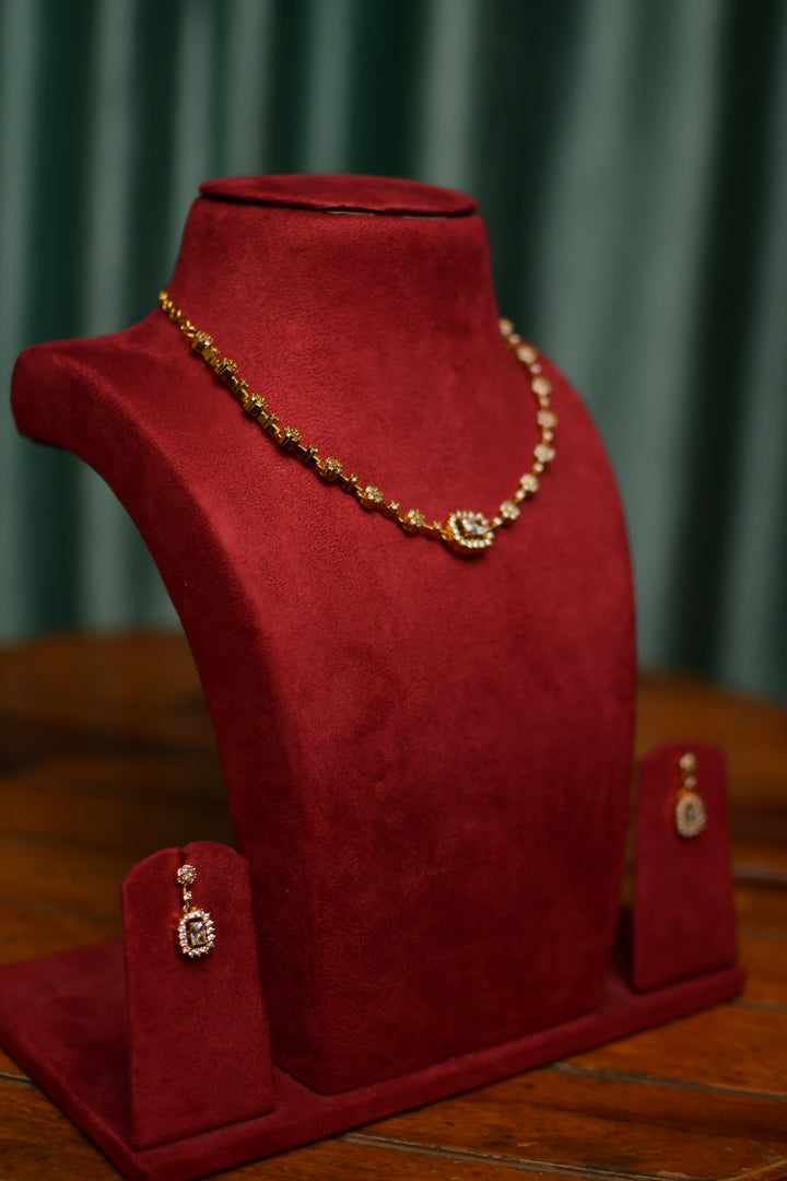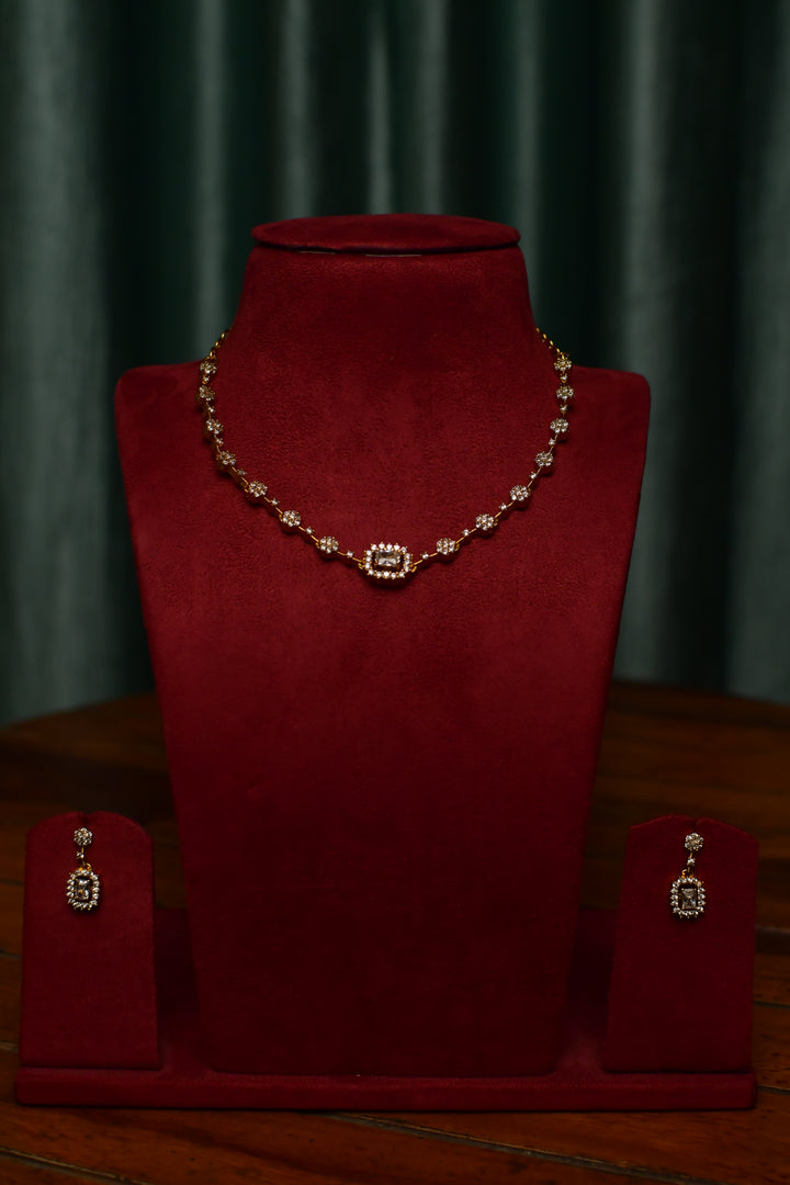 Enjoy understated elegance with this gold-plated choker necklace and matching earrings set, crafted around a stunning solitaire cluster design. The necklace features a refined line of pavé mini clusters leading to a single statement oval crystal centerpiece, balanced for effortless wear with sarees, kurtis, or western looks. Petite drop earrings echo the necklace’s sparkling cluster motif, making this set a go-to for both professional and special occasions.