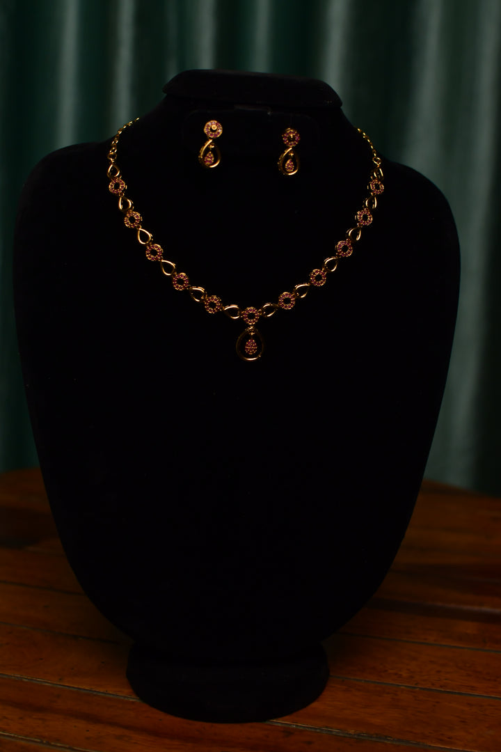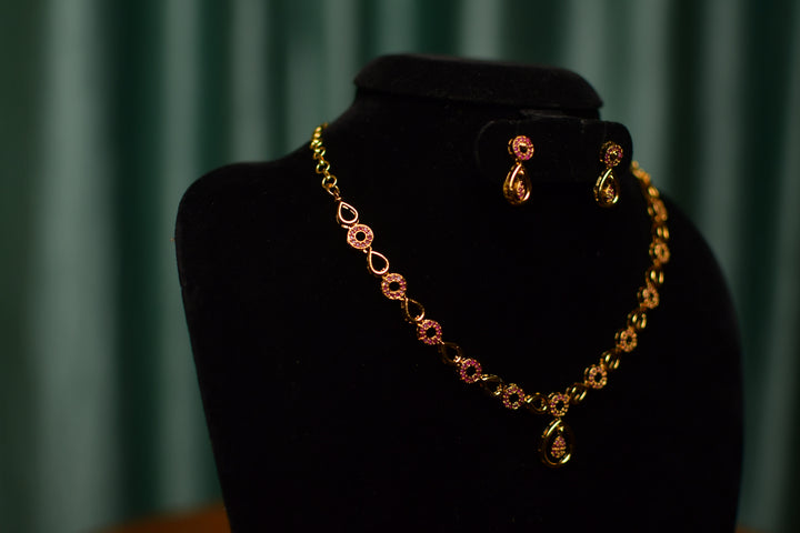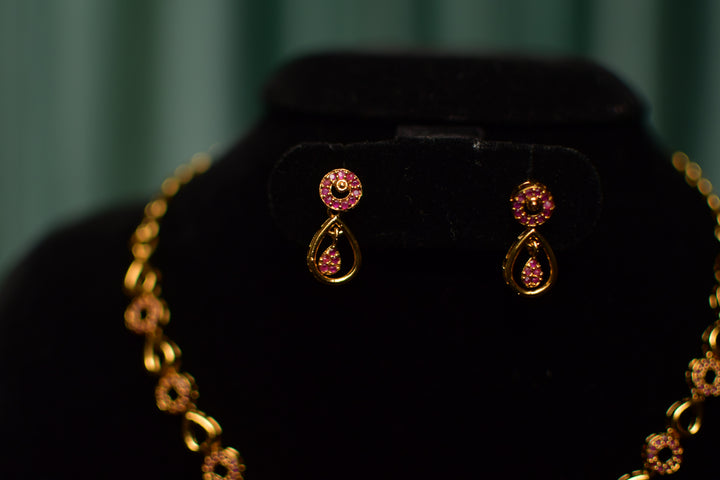 Light up every celebration with this unique gold-plated necklace and earrings set, crafted with alternating pink pavé circle and teardrop links for an eye-catching cascade. A central teardrop pendant delivers vibrant sparkle and balance, while matching stud earrings echo the teardrop and pavé motif for a coordinated, modern look—perfect for pairing with sarees, evening dresses, or gifting on special occasions.