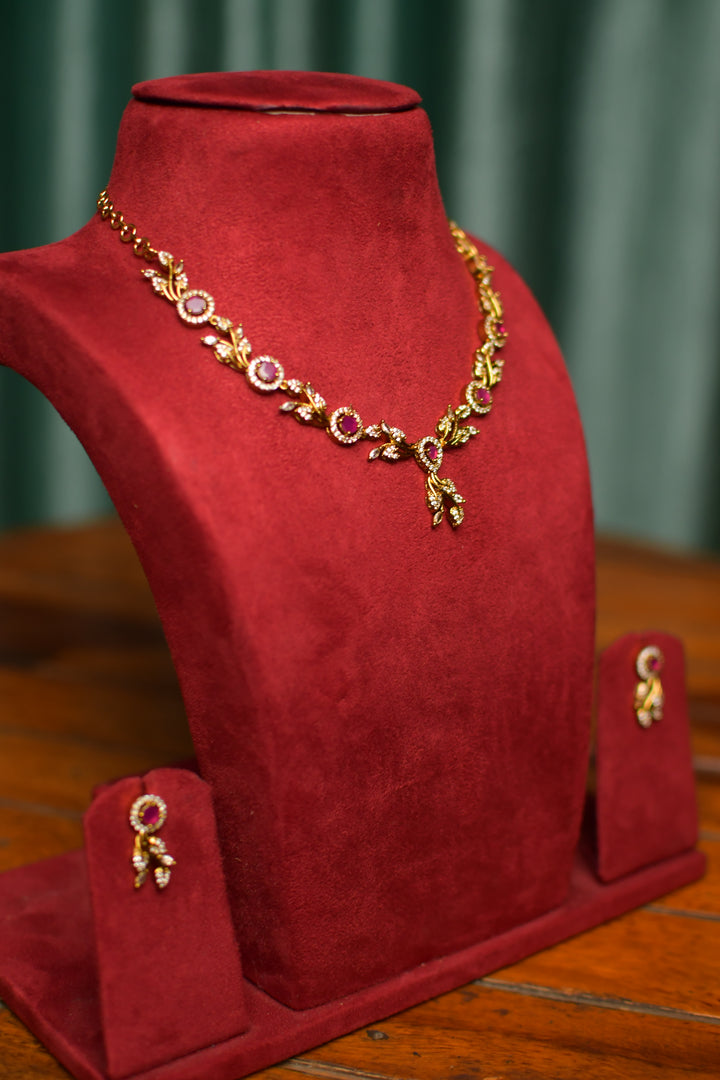 Gold vine necklace with round pink stones and diamond-cut pavé leaves